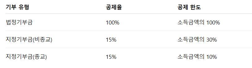 종교단체 기부금은 한도가 낮기 때문에 종교 10% + 비종교 30% = 최대 40% 구조를 고려해 기부 비율을 조절해야 합니다.
