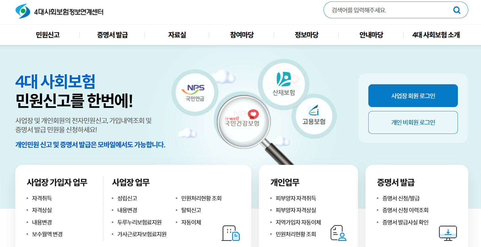 첫째, 4대 사회보험 정보연계센터에 접속한 뒤 개인 또는 사업장 대표 인증으로 로그인합니다. 공동·금융·간편 인증 등 다양한 인증 방식을 지원하고 있기 때문에 접근성은 높은 편입니다.