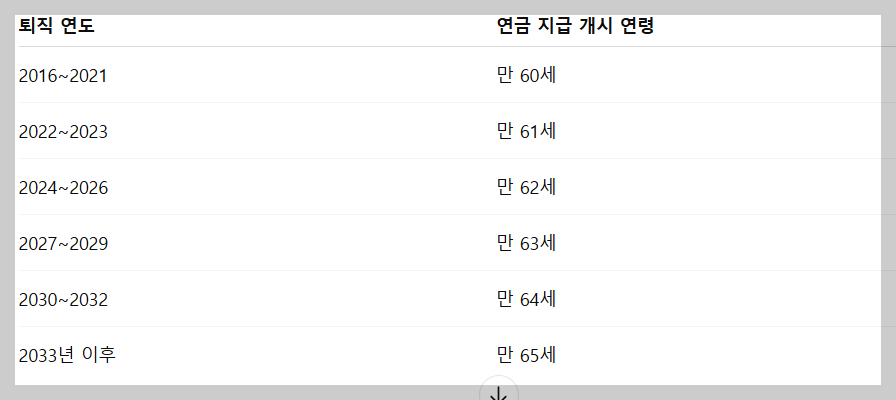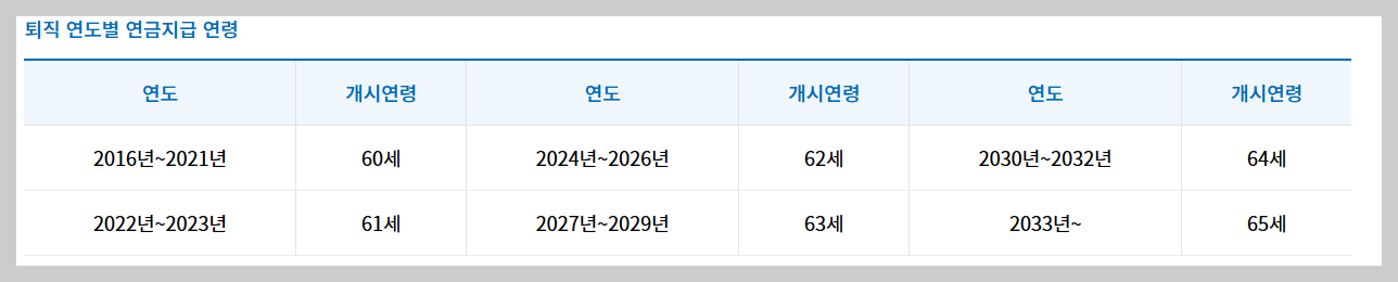 연금 개시 연령은 2016년 개정된 공무원연금법에 따라 2033년까지 단계적으로 상향됩니다.