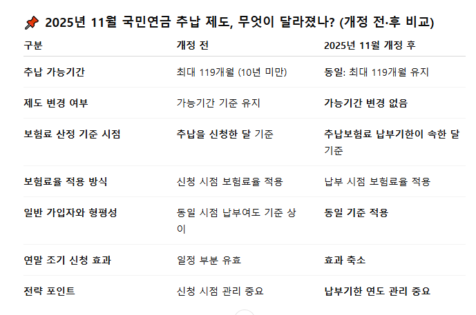2025년 11월 시행된 국민연금 추납 제도 개정 내용을 정리했습니다. 추납 가능기간 119개월은 그대로 유지되며, 보험료 산정 기준만 신청월에서 납부기한 기준으로 변경됩니다.
