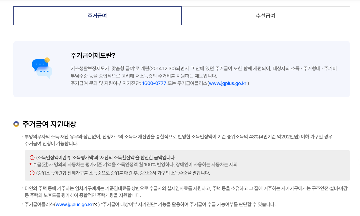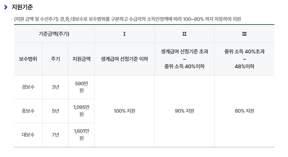 - 수선유지급여: 자가주택에 거주하는 가구 대상(주택 보수 지원)