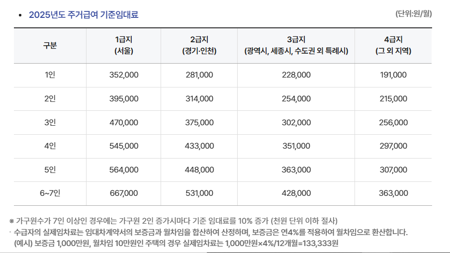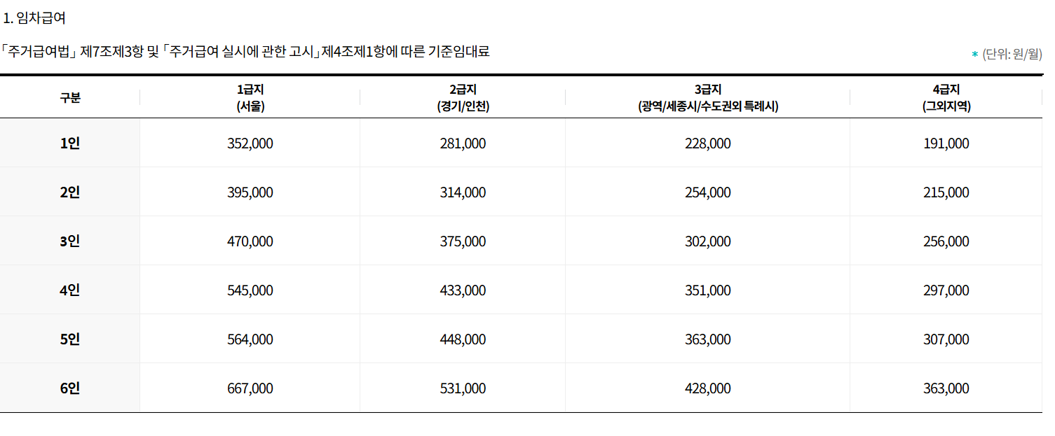 - 임차급여: 월세·전세 등 임대주택에 거주하는 가구 대상