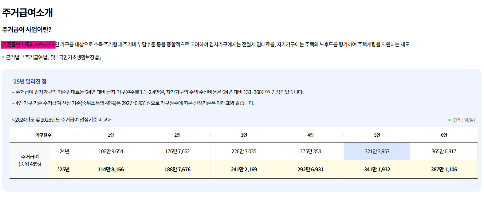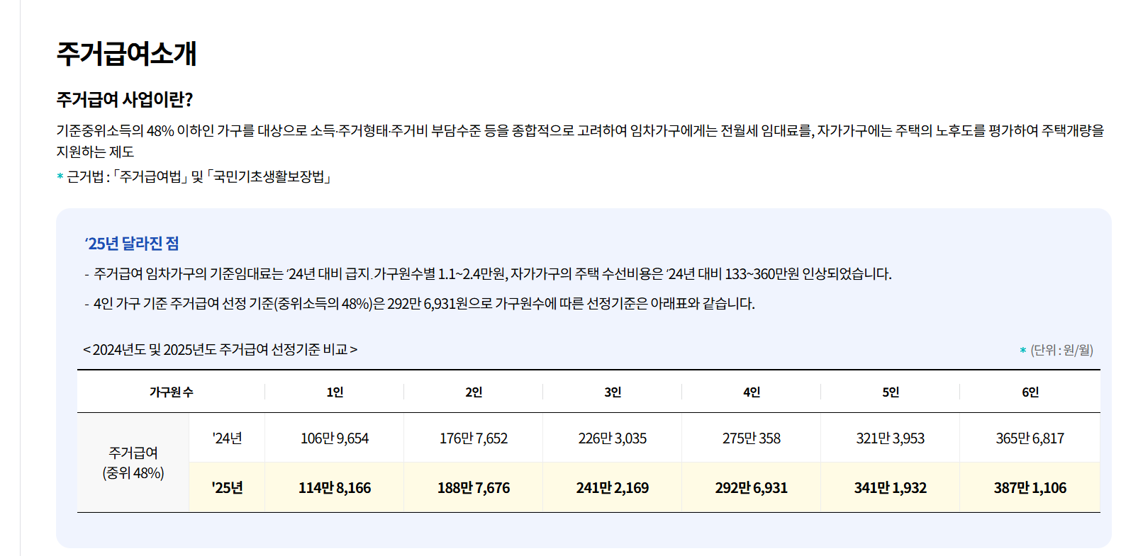 「국민기초생활 보장법」에 근거해 운영되며, 매년 기준 중위소득과 주거 여건 변화에 따라 신청자격과 지원금액이 조정된다.