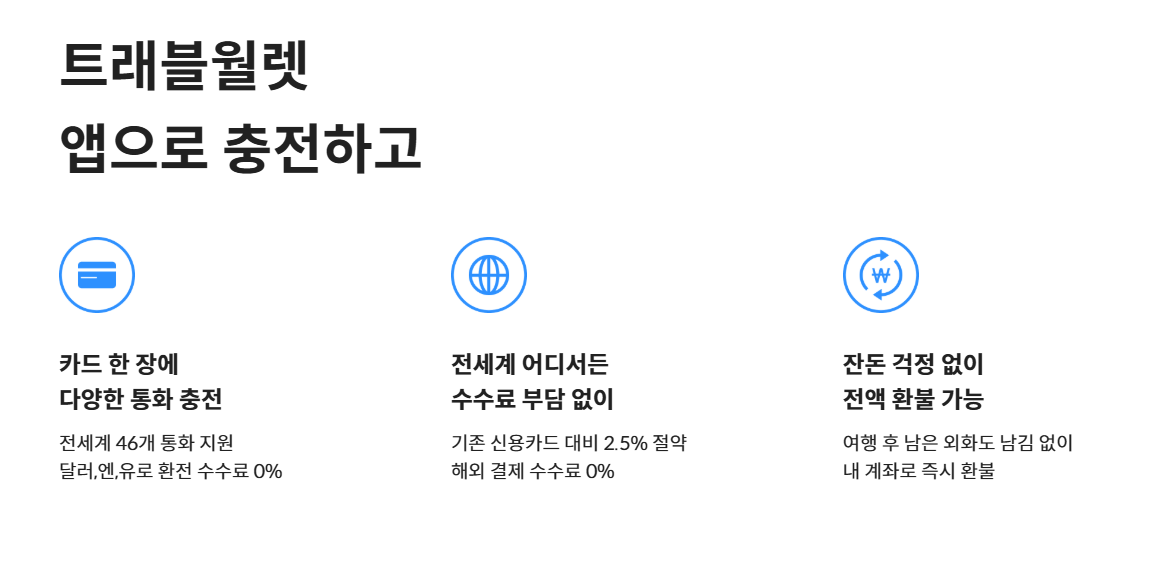 트래블월렛 카드는 체크카드나 신용카드와 달리 과소비 위험이 낮고, 해외 결제 수수료 구조가 단순하다는 점에서 여행용 카드로 활용도가 높습니다.