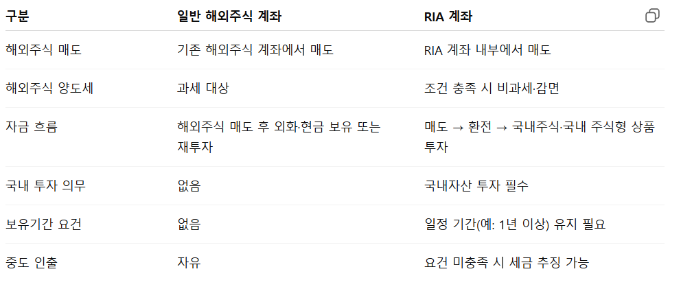 기존 해외주식 계좌에서 바로 매도하면 일반 과세가 적용되며, 반드시 해외주식을 RIA 계좌로 이체한 뒤 그 안에서 매도·환전·국내투자까지 이어져야 제도 요건을 충족합니다.