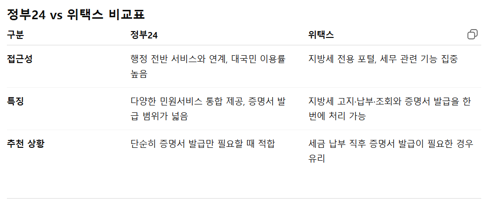 따라서 단순 발급 목적이면 정부24, 납부 직후 증명서까지 필요하다면 위택스를 활용하는 것이 효율적입니다.