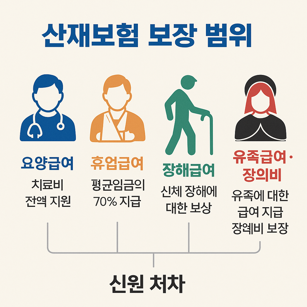 - 요양급여: 산재 지정 병원에서 치료비 전액 지원. 입원, 수술, 재활치료까지 모두 포함됩니다.